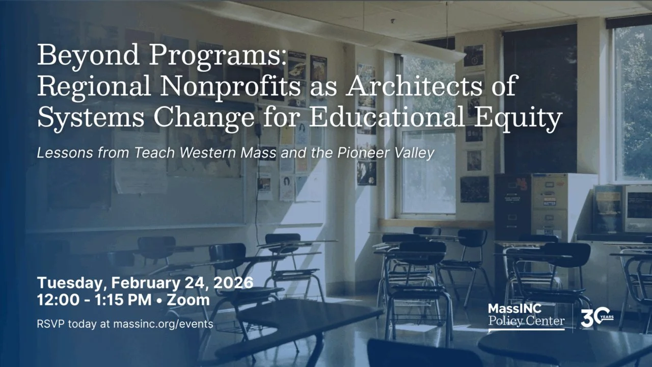 Watch our virtual panel exploring the evolving role of nonprofits as regional intermediaries at the forefront of education systems change. Drawing on a new MassINC Policy Center case study of Teach Western Mass, the discussion examined what it takes to move beyond direct programs to build collaborative, regional capacity aimed at addressing inequities in the educator workforce.
